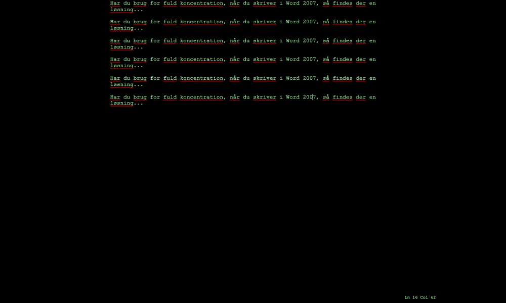 Udvidelsen giver dig en helt sort skærm i Word, så absolut intet kan distrahere dig. Faner, menuer og forvirrende farver er helt væk.
