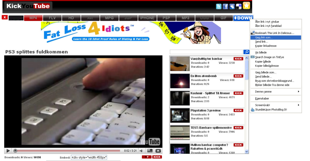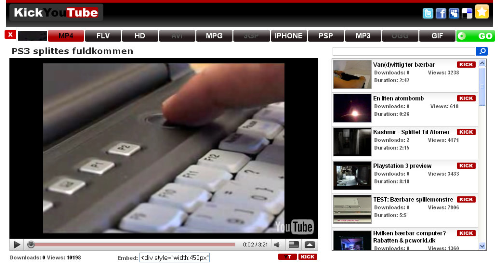 Inde på websiden KickYouTube.com har du forskellige muligheder for at downloade klippet, eksempelvis som MP4, MPG eller som FLV (flash-fil). Som en lille bonus er det også muligt udelukkende at hente klippet som MP3-fil, hvis du ikke interesserer dig for billedsiden.