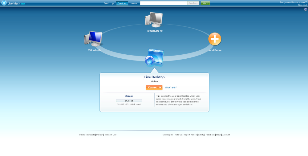 For at komme i gang med Mesh klikker du ind på www.mesh.com, hvor du skal bruge dit Live-Id til at logge ind. Her har du din Live Desktop, der er hjertet i Mesh. Du har fem gigabyte plads til rådighed, som du kan fylde med filer.