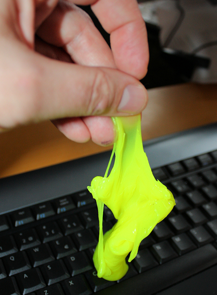 Hiv klatten ud af posen - eller spanden, hvis du har købt en af de store portioner. Glæd dig - eller gys - over den kølige og klæbrige fornemmelse mellem fingrene. Overvind dig selv - og smæk den gule slim ned på din elskede mobiltelefon, fjernbetjening, tastatur - eller hvad der nu skal have en tur med klatten.