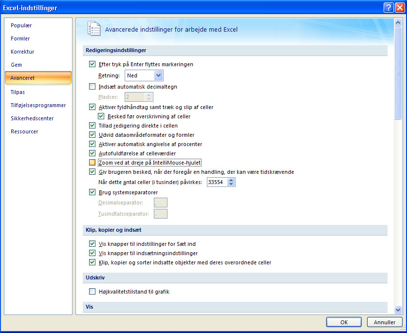Åbn Excel 2007 og klik på Office-logoet i øverste venstre hjørne. Klik på Excel-indstillinger og derefter på Avanceret. Her sætter du hak ud for 'Zoom ved at dreje på IntelliMouse-hjulet' og klikker derefter på Ok.