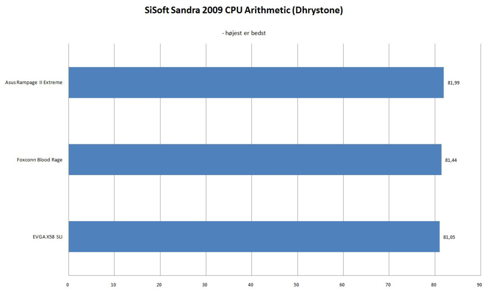 Vi benyttede processordeltestene i de syntetiske benchmarkprogrammer PCMark Vantage, PCMark 2005 og 3DMark 2006. Endvidere testede vi med ScienceMark og SiSoft Sandra, mens Far Cry 2 blev afviklet med laveste DirectX 9-kvalitetsindstillinger, igen for at teste processoren.