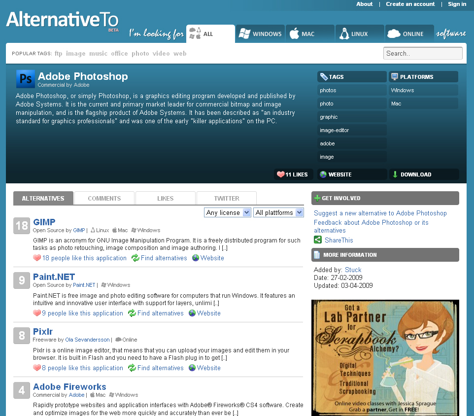På websiden kan du vælge det program, du vil finde alternativer til, derefter får du en liste over muligheder.