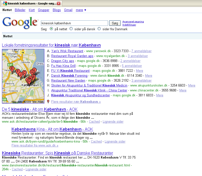 Skal du finde en restaurant i lokalområdet eller måske den nærmeste Føtex, så skriv søgeordet efterfulgt af bynavnet - for eksempel 'kinesisk københavn' - så får du en række resultater placeret på et kort.