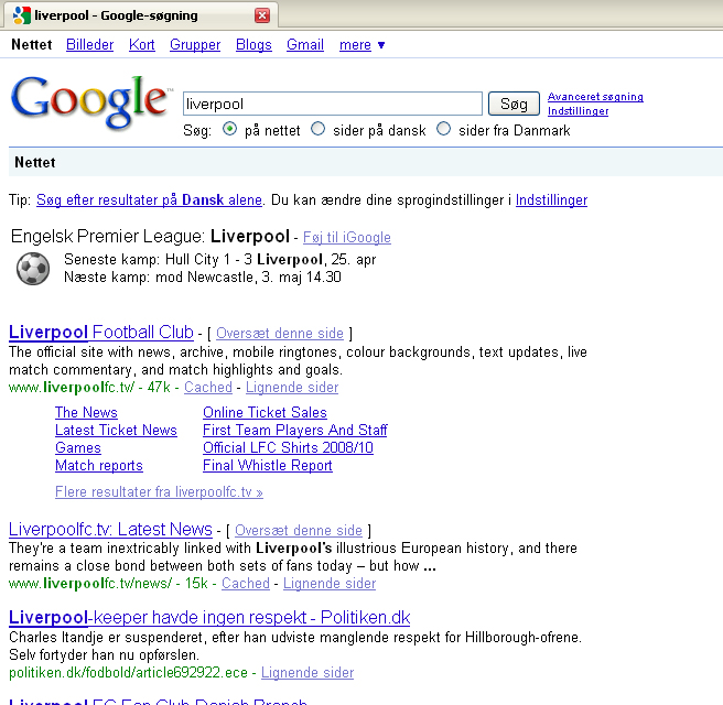 Følg dit udenlandske favorithold via Google. Er du fan af en klub i den bedste række i England, Frankrig, Tyskland, Spanien, Holland eller Italien, så skriv klubnavnet og søg. Over søgeresultaterne kan du se resultatet fra klubbens seneste kamp, og hvem de skal møde næste gang.