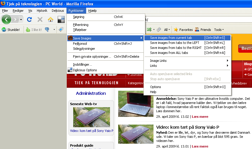 Med det installeret i browseren vælger du i værktøjslinjen Funktioner -> Save Images.