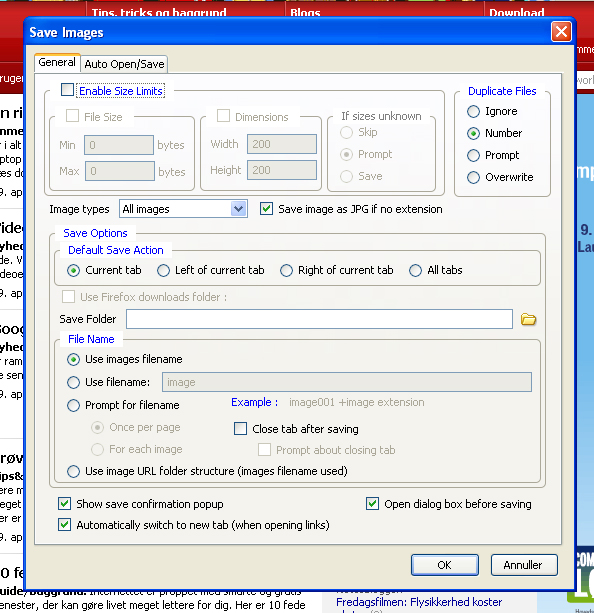 Det er også muligt at bestemme navngivningen af filerne, og om det kun skal være velkendte JPG-filer, eller om GIF og PNG-filer også er velkomne på din harddisk.