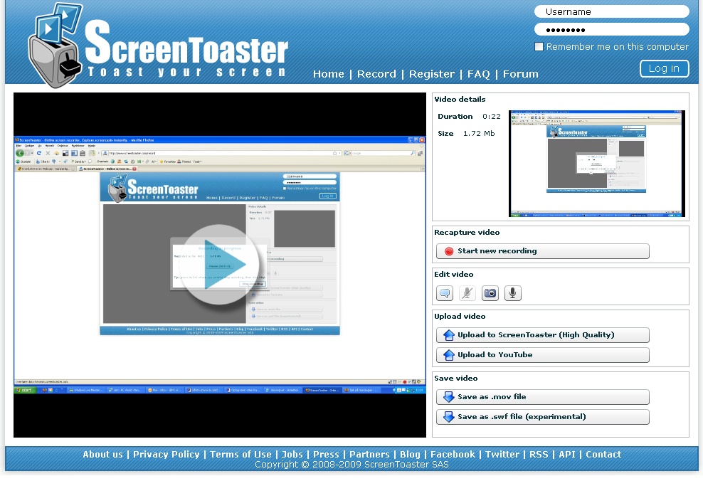 Du kan efterfølgende gemme din optagelse som MOV-fil (Quicktime) eller SWF-fil (flash), men du har også mulighed for at uploade den færdige videofil direkte til YouTube eller til Screentoast.com, hvis dine optagelser hurtigt skal ud til masserne.