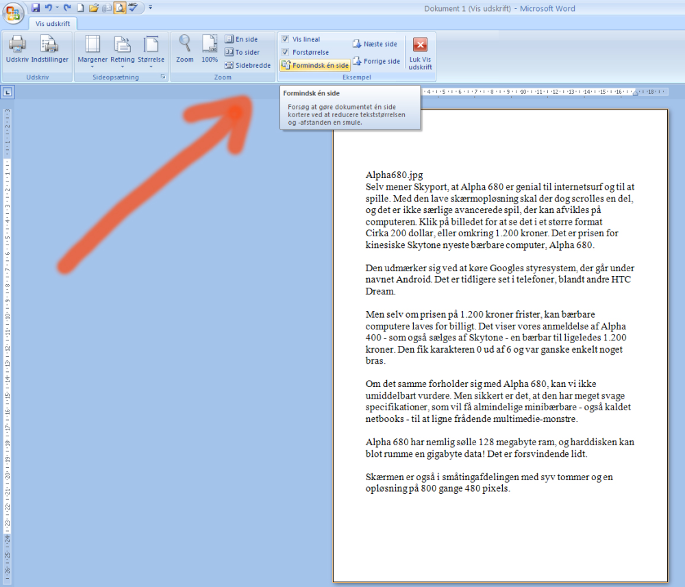 Men egentlig behøver du i Word 2007 ikke gøre ret meget for at få dokumentet mast ned på én side.