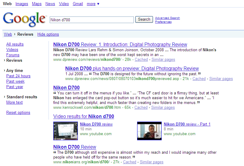 Hvis du eksempelvis er på jagt efter en anmeldelse af en it-dims, kan du vælge udelukkende at få vist anmeldelser (reviews), og Google vil forsøge at markere konklusionerne med citationstegn (se screenshot til højre).