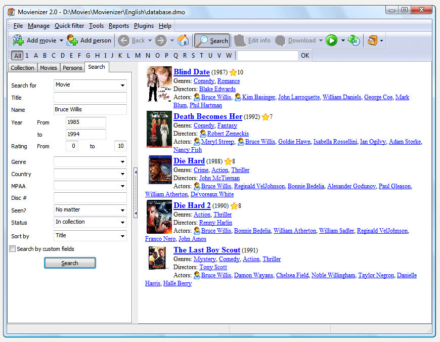 Desuden kan du i programmet indtaste navnet på din favoritskuespiller eller instruktør og derefter få vist alle de film, vedkommende har medvirket i eller skabt. Det er smart, hvis du mangler inspiration til at udvide dvd-samlingen med nye film, du endnu ikke har set.