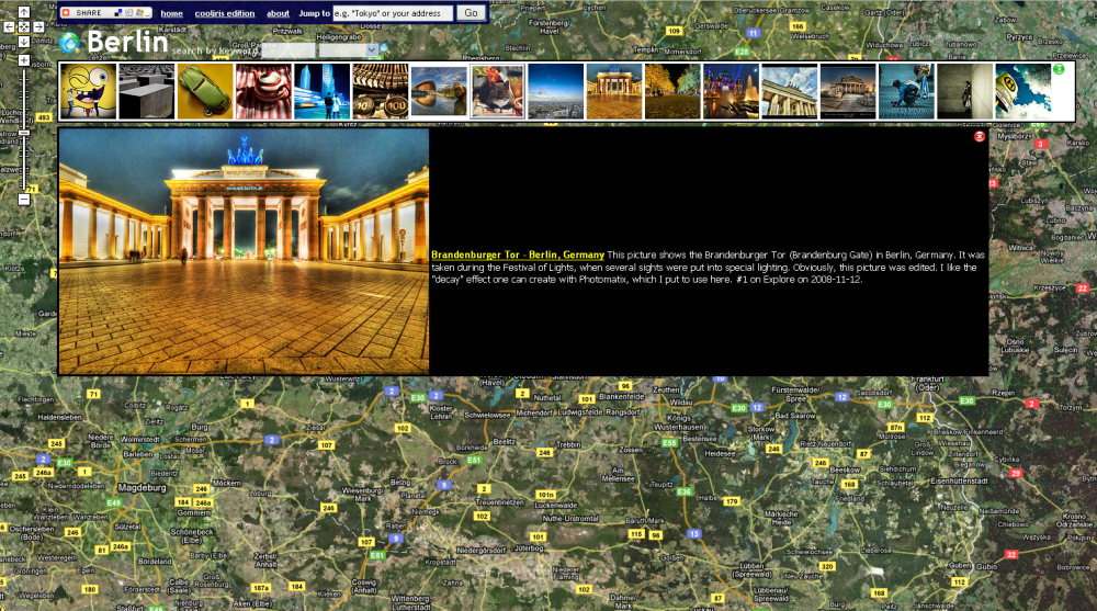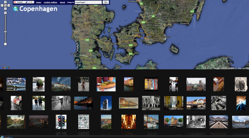 Som en lille bonus understøtter websiden også billedvisningsprogrammet Cooliris, som vi tidligere har skrevet om her. Det lægger sig normalt som en skal oven på din browser, og med lækkert layout kan du nu browse rundt mellem fotos og videoklip. Det er meget elegant og nemt at bruge. Earthalbum.com har fået integreret en del af Cooliris, så du får den meget lækre bladre-funktion, når der navigeres. Det kræver dog, at du har Cooliris installeret. Læs mere om Cooliris her.