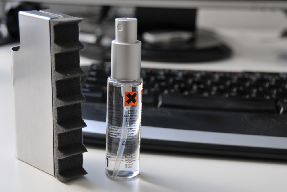 Det er en noget mere traditionel og elegant løsning og består af en lille flaske med bakteriedræbende væske og en holder med skumtænder, der kan bruges til at børste tasterne på keyboardet.