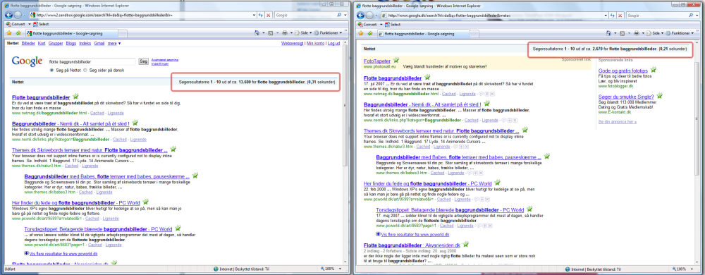 A: Prøv at søge efter "flotte baggrundsbilleder" I både Google og i Caffeine. Resultaterne er praktisk talt ens på første side, hvor de fleste kun kigger. Men hvor den ordinære Google finder lidt over 2.500 resultater, så finder Caffeine over 13.000 resultater.