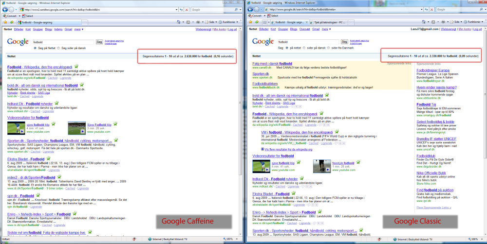 Efterhånden, som der arbejdes videre på Caffeine, kan resultatet ændre sig, men pt. er forskellen ikke så stor. Søg eventuelt selv efter flere eksempler på: http://www2.sandbox.google.com/