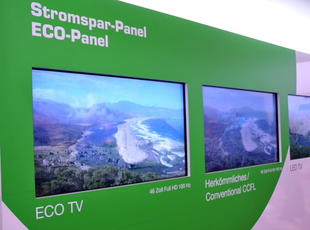 For stort set alle fladskærmsproducenter vil være grønne, og på IFA-messen var der skilte med træer, græs, vindmøller og blade. Det var så omfattende, at miljøorganisationen Greenpeace næsten ikke kunne have gjort det bedre.