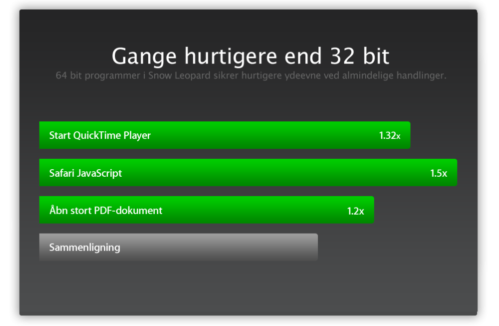 Det skal dog siges, at alle de medfølgende programmer i Mac OS X Snow Leopard er skrevet i 64-bit, så her er der fuld fart over feltet.