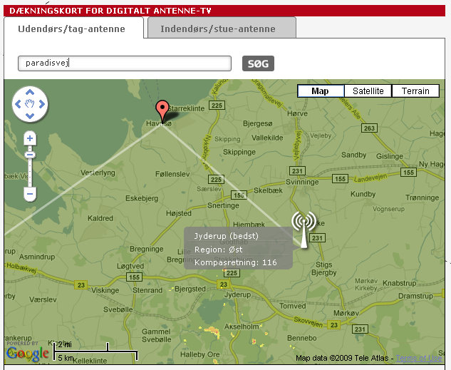 Derefter zoomer kortet ind på området og viser, hvordan muligheden er for at fange digitalt tv netop her. De nærmeste sendemaster - og den med det bedste signal - udpeges også. Den er relevant i forhold til, hvilken vej du skal pege din stue- eller tagantenne.