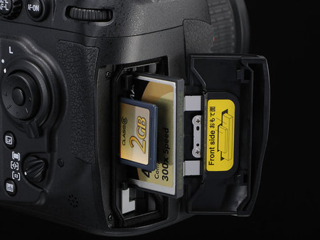 Det var noget, som vi første gang så på det professionelle Nikon D3. Det havde plads til to CompactFlash-kort. Med D300s er der også to pladser, men den ene er til CompactFlash og den anden til SD-kort.