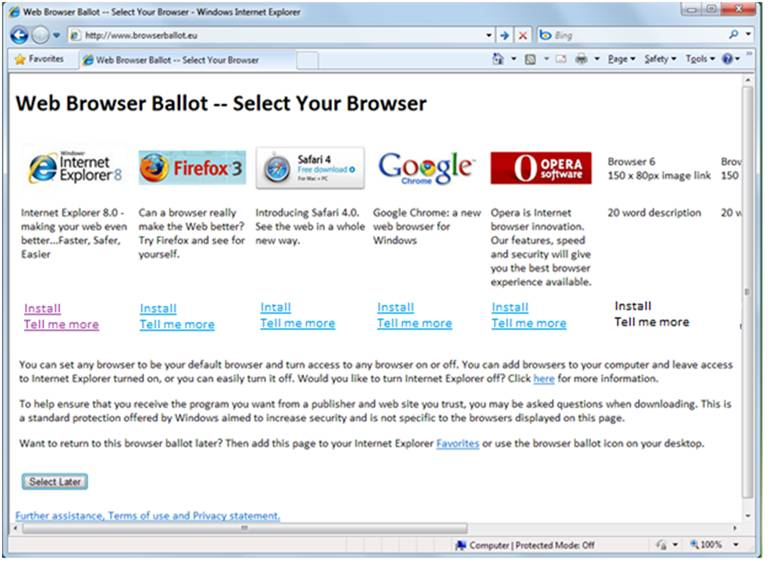 På valgskærmen bliver IE ikke det første valg. De fem mest populære browsere vil stå listet i alfabetisk rækkefølge. Hvis din favoritbrowser ikke er i blandt, kan du få fremvist yderligere syv mindre kendte browsere, der ligeledes er listet i alfabetisk rækkefølge. Brugerne får altså mulighed for at vælge mellem i alt 12 browsere (se nogle af nettets mere ukendte browsere her).