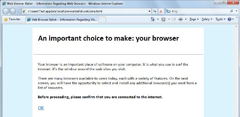 Installerer du Windows 7 fra bunden af, vil Internet Explorer som udgangspunkt være standard-browser, men første gang man kører en Windows Update, dukker den såkaldte ballot screen op, som giver brugeren mulighed for at vælge en anden browser end IE.