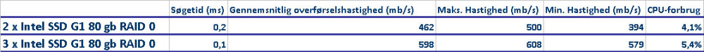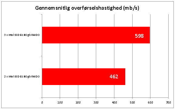 Begge dele klarede Adaptec 5405 uden problemer, ligesom en test med hele tre lynhurtige Intel SSD-diske lod os nærme os de 600 megabyte i sekundet i overførselshastighed.