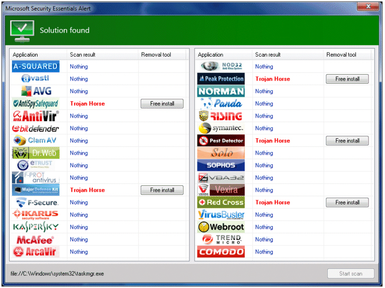 De uheldige brugere præsenteres blandt andet for nedenstående meddelelse, der giver et overblik over 32 forskellige antivirus-produkter.