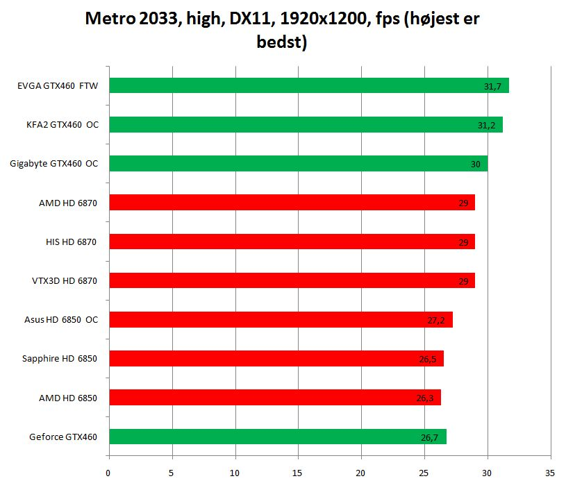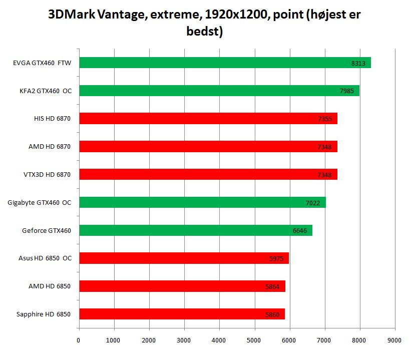 Frekvensforøgelsen er på over 25 procent sammenlignet med standardniveauet på 625 megahertz. I samspil med let overclocket GDDR5-hukommelse betyder det, at ethvert 6870-grafikkort med standardhastigheder bør føle sig truet på ydelsen alene: EVGA Geforce GTX 460 1 GB FTW lander et 3DMark Vantage-resultat, der er næsten 1.000 point højere end standard 6870-kort, ligesom spilydelsen i flere titler er et nøk højere.