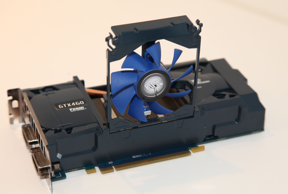 Med KFA2 har den noget ukendte grafikproducent Galaxy holdt indtog i Europa, og vi tøver ikke med at rose udformningen af den anderledes køler på producentens Geforce GTX 460-kort, der adskiller det fra de grå masser. En sjov detalje er, at du kan "løfte" køleren og dermed nemmere fjerne det skidt og støv, der med tiden ophober sig på køleribberne.