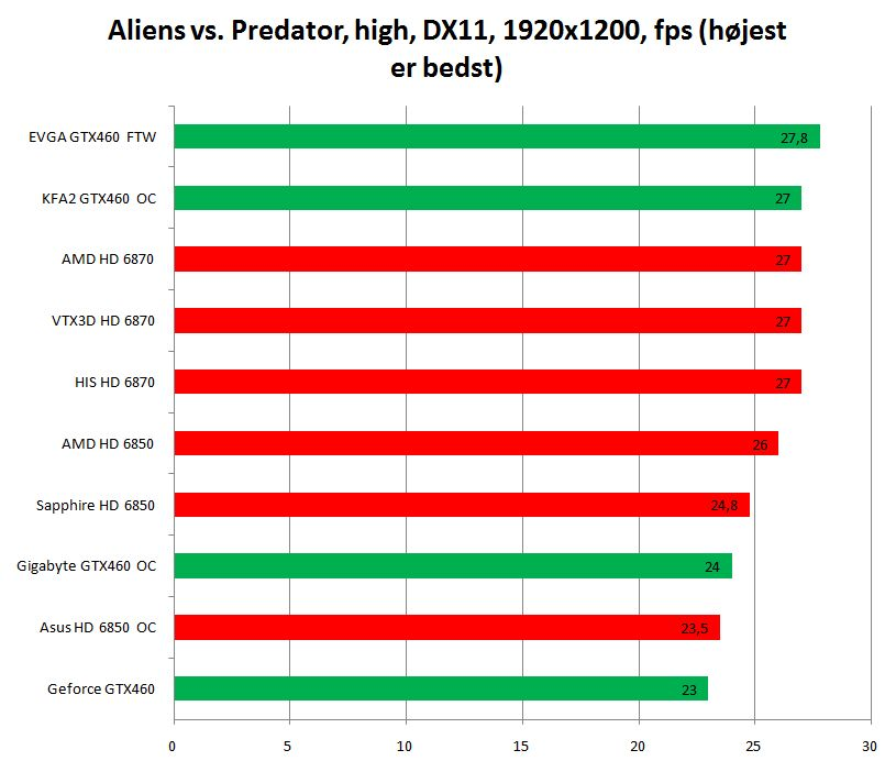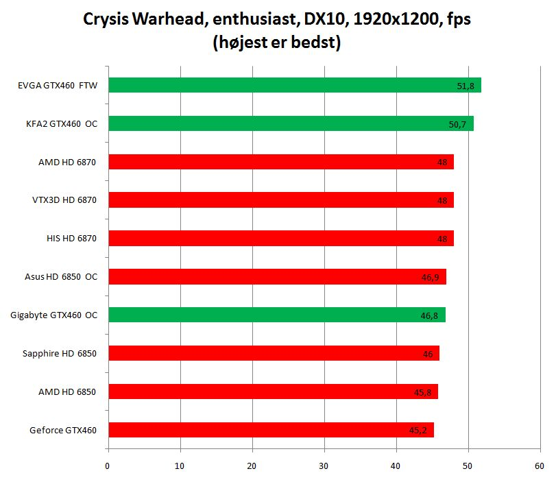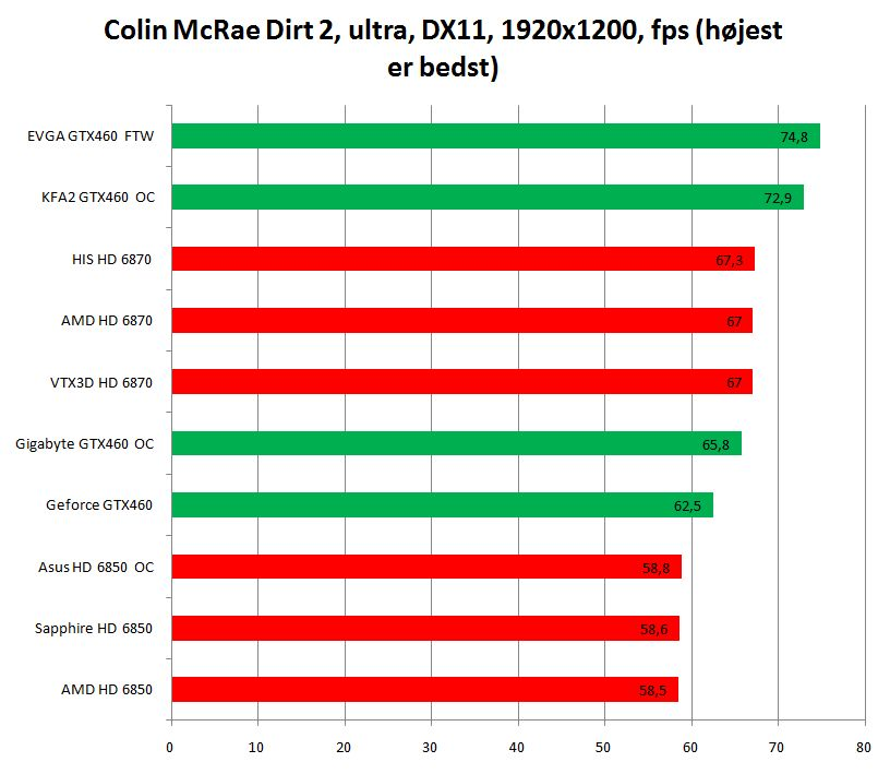 KFA2-kortet er ydelsesmæssigt ikke helt på niveau med det hurtige og varme GTX 460 fra EVGA, men GPU-frekvensen lyder alligevel på imponerende 810 megahertz, og hukommelsen kører 4.000 megahertz. Det giver kortet den gennemsnitligt næsthøjeste ydelse i testen, men støjniveauet tiltrækker sig dog en smule kritik, for den ekstravagante køler er ikke ligefrem stille som en ninja.