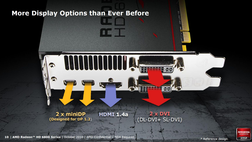De nye AMD-kort har som udgangspunkt to DVI-tilslutninger såvel som et HDMI 1.4-stik og to Mini DisplayPort 1.2-stik. Især sidstnævnte påkalder sig opmærksomhed, for AMD er først på markedet med DisplayPort 1.2-løsning. Med en såkaldt skærm-hub, kaldet MST, vil du i fremtiden ifølge AMD kunne koble mere end én skærm til hvert DisplayPort-stik takket være den øgede båndbredde.