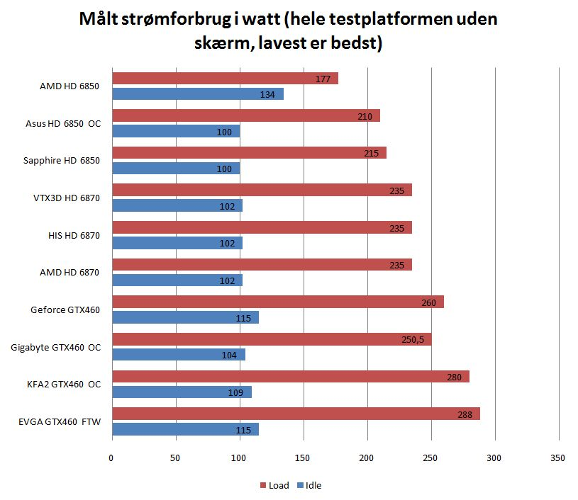 Ydelsesmæssigt spurter HD 6870 mod målstregen næsten side om side med GTX 460 1GB, og forspringene de to kandidater imellem er minimale, afhængigt af hvilken titel der duelleres i. HD 6870 får dog især anbefalinger med på vejen, når strømforbruget tages i betragtning, for her frådser Nvidias GTX 460 væsentligt mere.