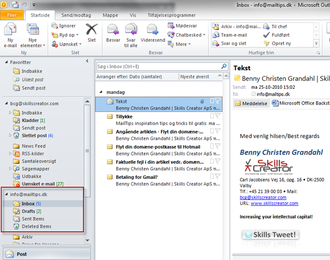Klik på OK-knappen og vælg derefter eventuelt Send/Modtag i Outlook. Så hentes dine mails fra Hotmail ind i Outlook. Mailene gemmes i en separat postkasse, som du finder nederst i Navigationsruden til venstre i Post-sektionen i Outlook.