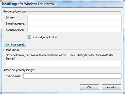 Ønsker du at give postkassen et mere sigende navn i Navigationsruden i Outlook, klikker du på Avanceret-knappen. Så udvides dialogboksen, og du kan tilføje et mere beskrivende navn til kontoen, ligesom du har mulighed for at angive, hvilken mailkonto de mails, du sender fra kontoen, skal anvende.