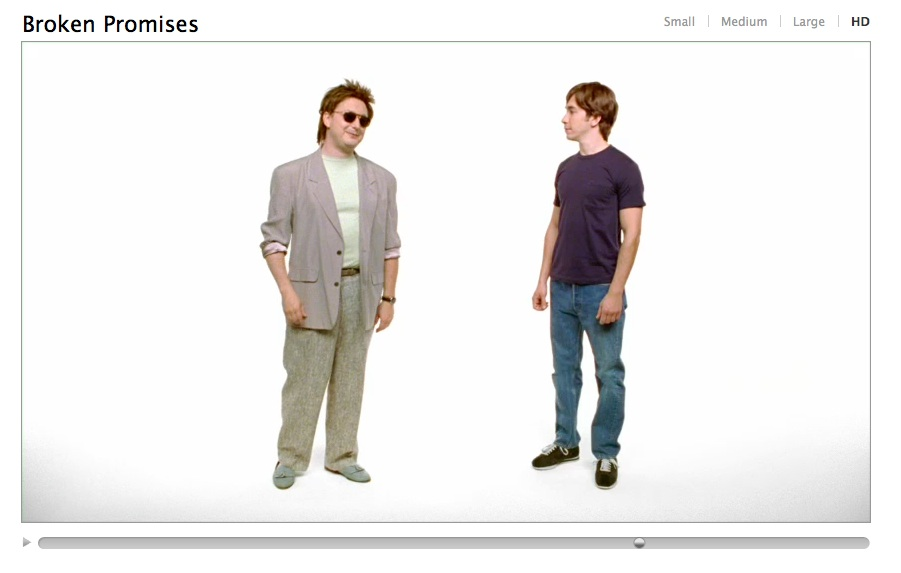 I den første reklame, Broken Promises med skuespillerne John Hodgman (kendt fra The Daily Show) og Justin Long, fortæller Apple historien om, hvorledes Microsoft altid har lovet, at det nye Windows ville være bedre.