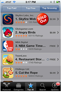 Da browseren blev lanceret for kort tid siden, strøg den på få timer til tops som det bedst sælgende program på App Store. Faktisk var efterspørgslen så massiv, at Skyfire måtte melde "midlertidigt udsolgt". Det skyldes, at serverne, som browseren bruger til at forvandle Flash-indhold til noget, iPhone gider afvikle, ikke kunne følge med antallet af nye brugere.