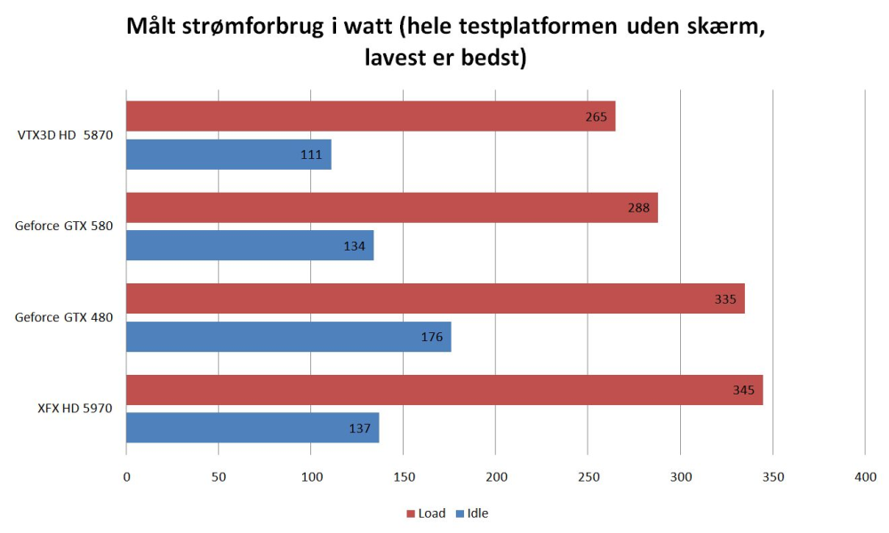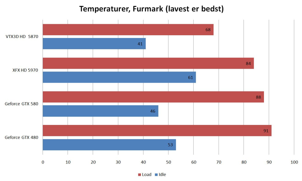 Selv da vi med det nye grafikkort i computeren fyrede op under vores sædvanlige samling af testprogrammer, var støjforureningen væsentligt nedsat i forhold til GTX 480 og AMD's hidtil kraftigste kort, Radeon HD 5970. Det nye GTX 580-kort var heller ikke så velegnet til at varme stuen op som det gamle GTX 480 (hvilket bestemt ikke er et minus).