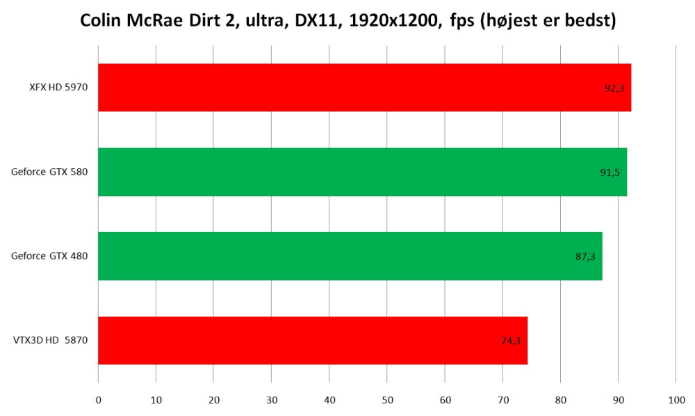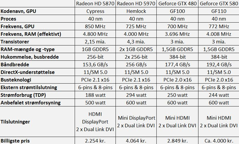 Med et prisskilt på omkring 4.000 kroner afhængigt af hvilket retail-kort, du vælger, er GTX 580 imidlertid også gået frivilligt i ringen mod AMD's HD 5970. AMD-kortet er for det meste et nøk hurtigere, men de to kort er groft sagt meget jævnbyrdige. Efter så mange måneder ved tegnebordet overrasker det os, at Nvidia stadig ikke uddeler behørige smæk til konkurrentens vildeste alternativ.