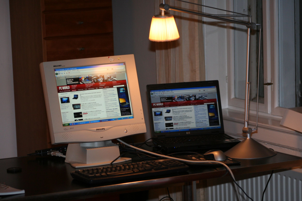 Med musen flyttes cursoren på magisk vis fra den ene skærm til den anden, og det dokument, man skriver på, bliver skrevet på begge skærme. Både på den bærbares skærm og den stationære skærm, man har valgt til hjemmearbejdspladsen.