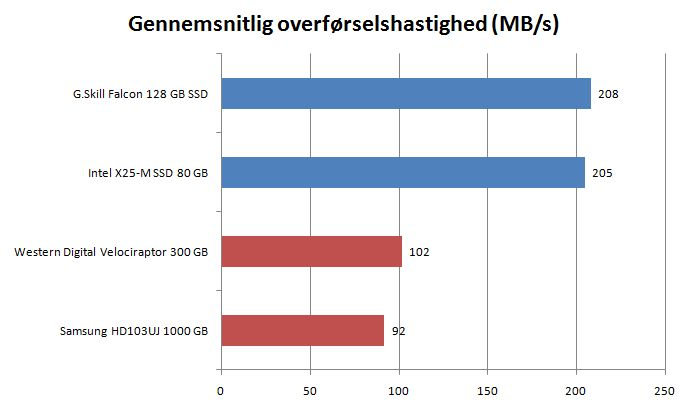 Til sammenligning vil en Western Digital Velociraptor-harddisk fastholde hårdnakket, at overførselshastigheder i omegnen af 120 MB/s er realistisk, mens adgangstiden er godt ti gange langsommere end det, en aktuel SSD lægger for dagen.