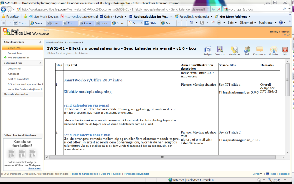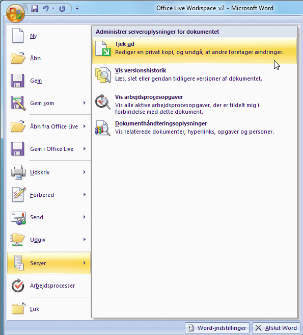 Når der er flere, der samarbejder om det samme dokument, skal I sørge for at bruge Tjek ind og Tjek ud-funktionen på Office Live Workspace. Den låser dokumentet til én person, så det er kun er muligt at rette i det for en enkelt bruger ad gangen. Alle andre kan kun åbne og læse dokumentet. Derved undgår I, at der opstår flere versioner af dokumentet.