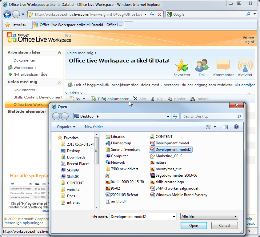 Filer uploader du via Tiføj dokumenter-dialogboksen, og du er ikke begrænset kun til Office-dokumenter. Eksempelvis kan du også uploade en MP3-fil eller et PDF-dokument. Ikke alle slags filer er dog spiselige for Office Live Workspace. Den "smager" nemlig på det, du uploader, og afviser for eksempel programmer eller .zip-filer for at blokere visse indholdstyper.