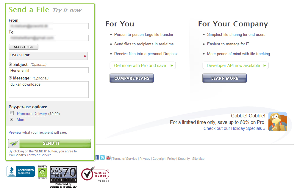 Med YouSendIt kan du sende filer, der fylder 100 megabyte. Webtjenesten er ikke særlig avanceret, men fungerer fint. Du skal vælge e-mailadressen på en modtager, der får tilsendt et link til den fil, som du har uploadet. Du kan naturligvis blot vælge at sende den til dig selv.
