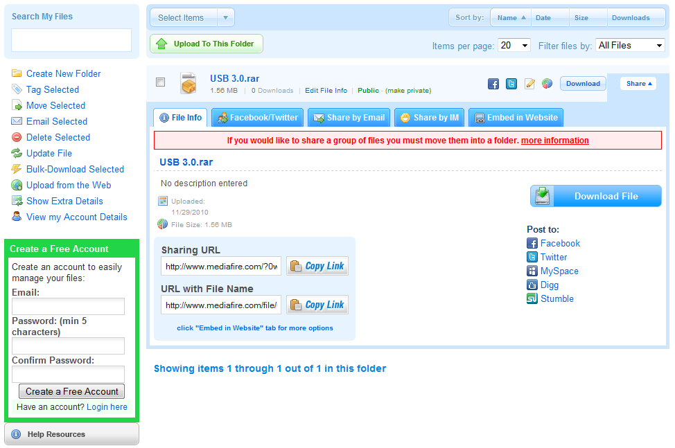 Mediafire.com er en af de bedste webtjenester til hurtig fildeling. Det kræver ingen registrering at bruge Mediafire, der ud over download af dine filer også byder på mange avancerede muligheder, blandt andet kodeordsbeskyttelse af dine filer. Du må gemme filer, der fylder op til 200 megabyte stykket. Klik for større foto.