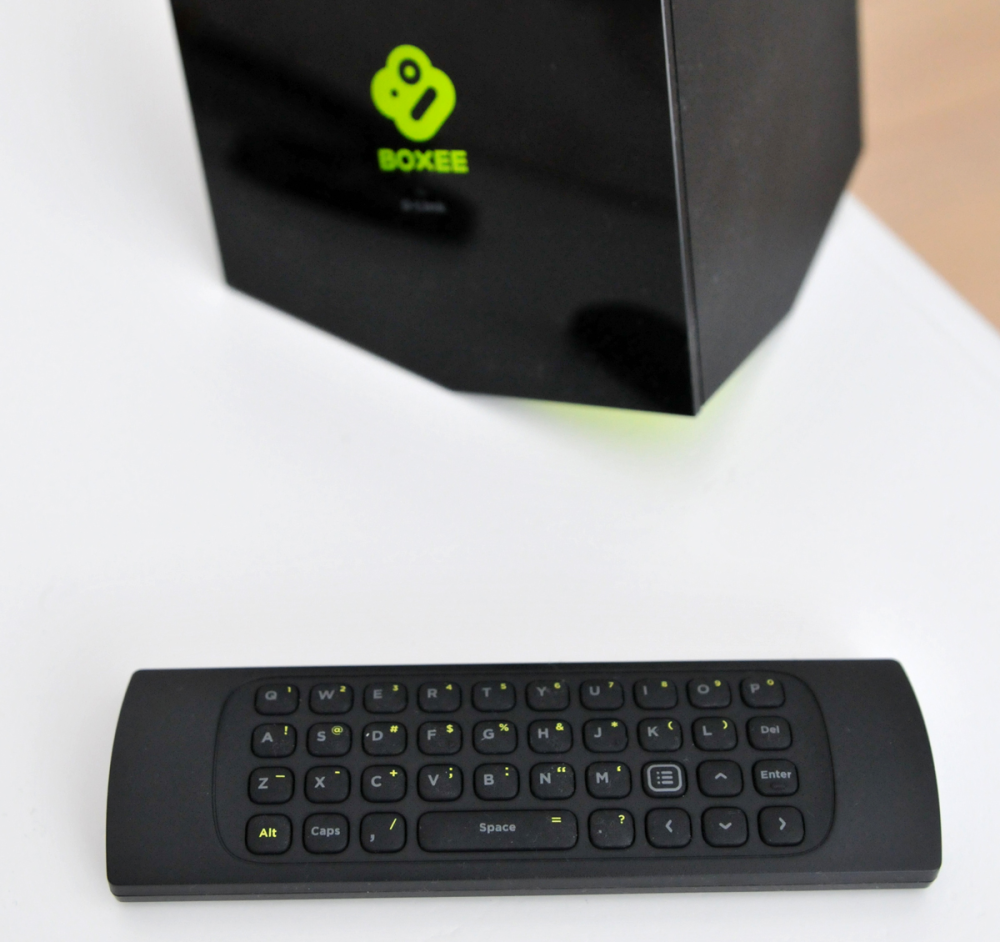 Der følger en fjernbetjening med til tv-boksen, og den er rigtig godt tænkt. På forsiden har den en lille håndfuld knapper, der bruges til at navigere rundt i menuerne på Boxee Box. Det er udmærket, men den store overraskelse er på bagsiden af fjernbetjeningen.