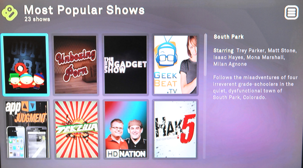 Heldigvis gør Boxee det næsten godt igen med Apps. Det er et menupunkt, der - som navnet antyder - indeholder en masse småprogrammer. Der findes i skrivende stund over 130 forskellige, og de giver dig blandt andet adgang til videopodcast.