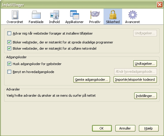 Det er enkelt at installere Password Exporter. Når det er gjort - husk at genstarte Firefox efter installationen - kan du vælge Funktioner og Indstillinger. I indstillinger kan du trykke på ikonet for sikkerhed. Så ser du nedenstående skærmbillede.