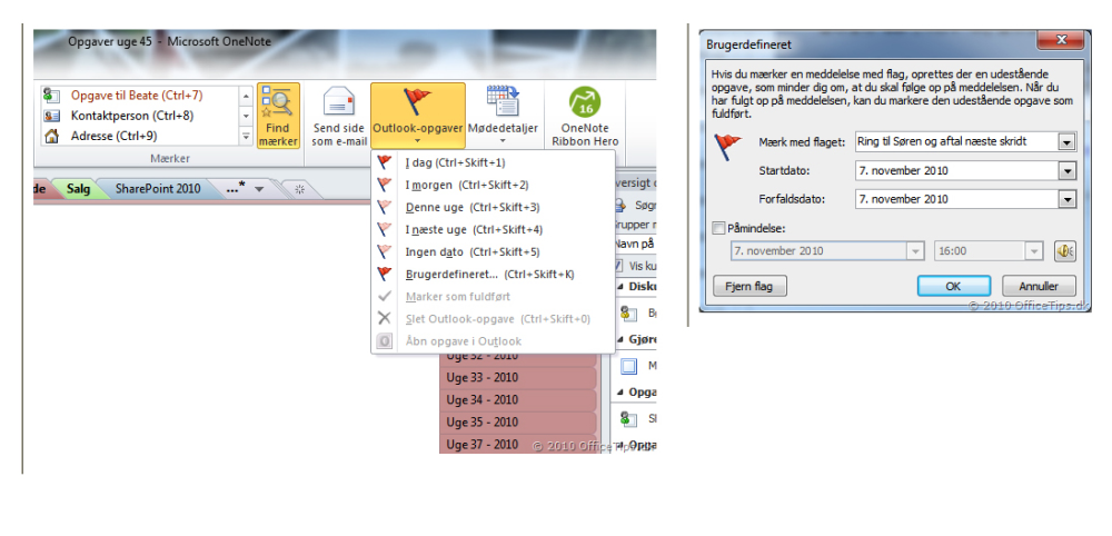 En anden fiks detalje er, at du kan indsætte opgaver fra OneNote i Outlook blot ved at klikke på Outlook-opgaver-knappen i Outlook-gruppen til højre på Startside-fanen. Så bliver du husket på opgaven i Outlook, og du kan konvertere opgaven til en aftale i din kalender, hvis du har behov for at afsætte tid til at løse opgaven i. Når du klikker på Outlook-opgaver-knappen, kan du sætte et af standard-opfølgningsflagene eller oprette dit eget ved at klikke på Brugerdefineret i menuen. Vælger du dette, får du mulighed for at skrive, hvilken handling du skal foretage på opgaven, i Mærk med flaget-feltet.