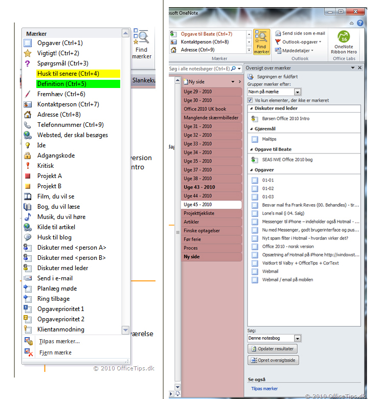 For - og nu kommer det rigtig smarte - OneNote kan med et snuptag skabe overblik over alle dine mærker, og oversigten er grupperet, så du f.eks. lynhurtigt kan få overblik over, hvad du skal huske at tale med din chef om, næste gang du er sammen med ham eller hende, blot ved at huske altid at mærke de ting, du skal vende med chefen med det særlige Diskuter med leder-mærke.