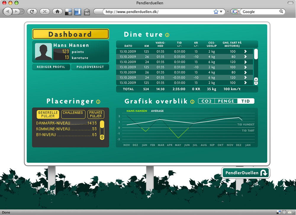 Når man begynder at lægge data om sine køreture ind i PendlerDuellen.dk, så får hver enkelt bilist løbende en oversigt over sin kørsel, og hvilken indflydelse kørestilen (og hastigheden) har på køretid, økonomi, trafiksikkerhed og klima.